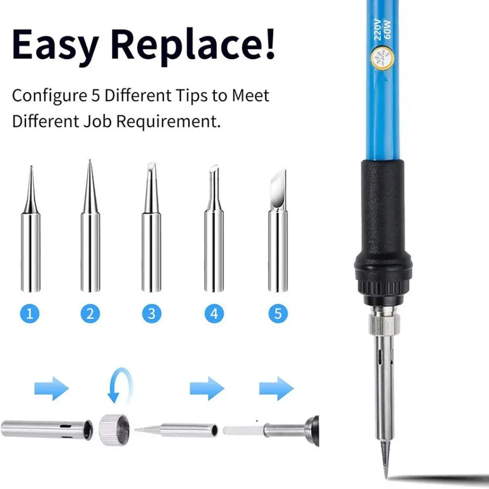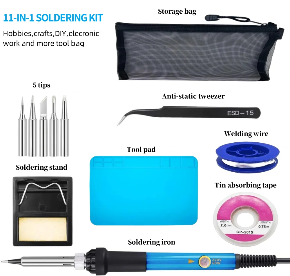 Basic soldering iron kit: This package comes with soldering iron, 5 solder tips, soldering stand, welding wire,tin absorbing tape, tool padstand, tweezers and a portable storage bag. This tool set can meet all of your basic soldering project needs. DESIGN FOR BEGINNERS.
