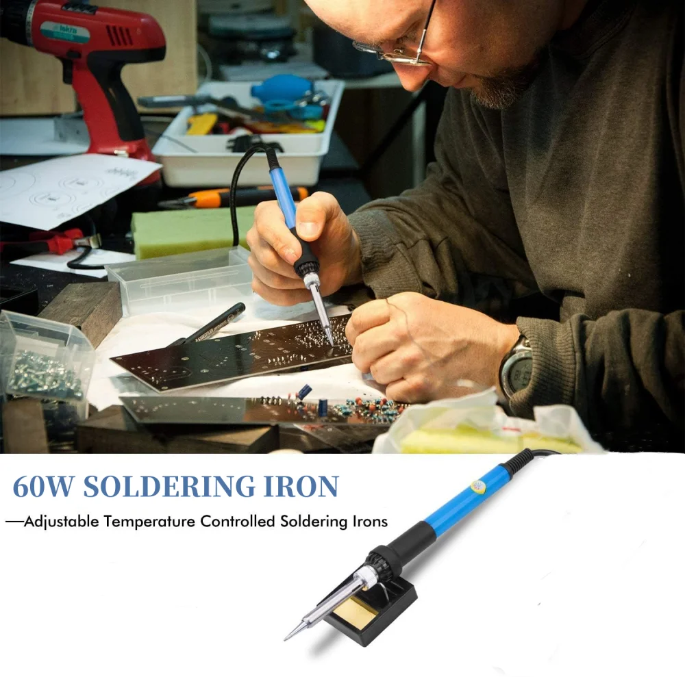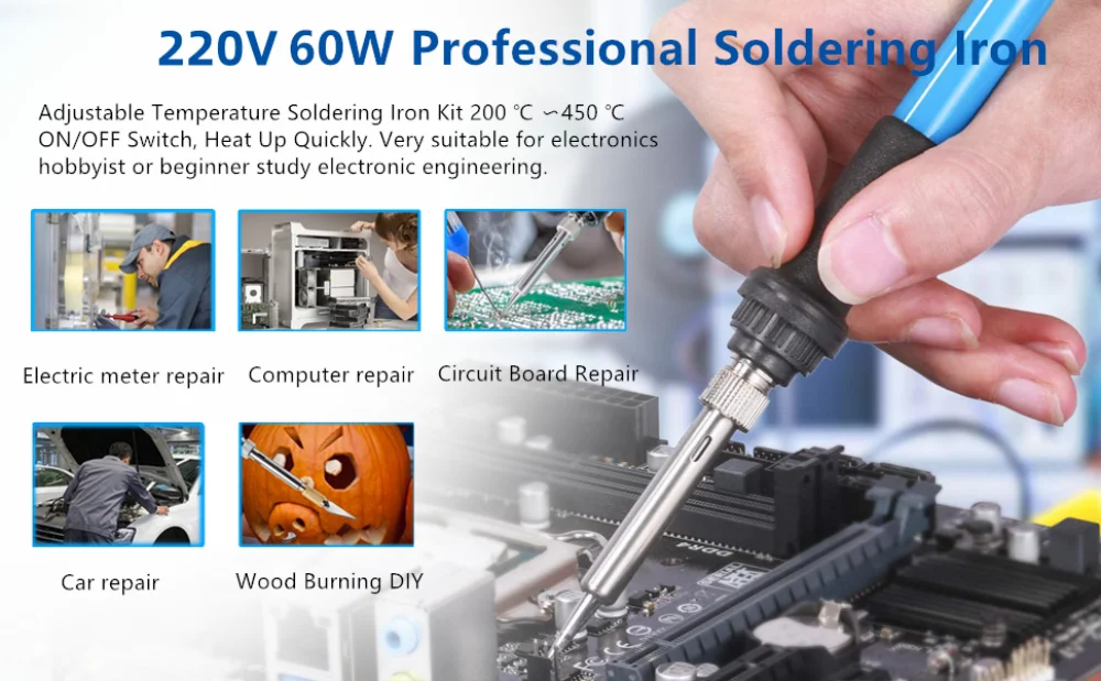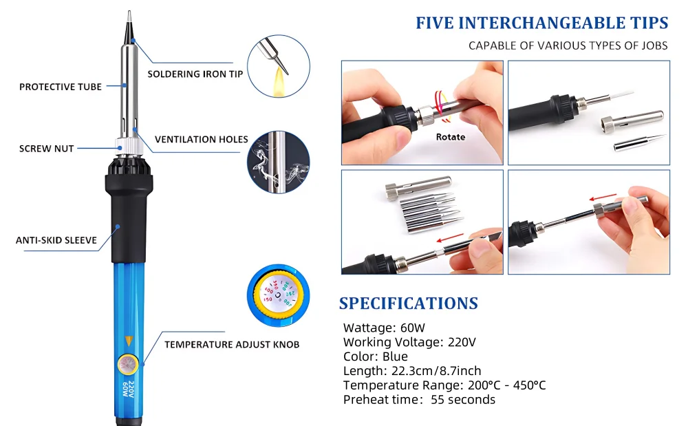 Heat up quickly & energy saving : The 220V 60W soldering iron features an advanced ceramic printed heater to heat up to the targeted temperature quickly, and adjustable temperature range 200~450℃ with large venting holes make it much more energy-efficient.